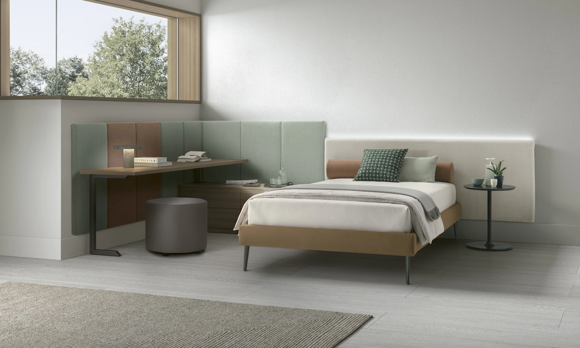 Il letto singolo Boiserie in tessuto nella fotografia, tra i modelli imbottiti moderni di V&Nice, è pensato per garantire il riposo migliore.